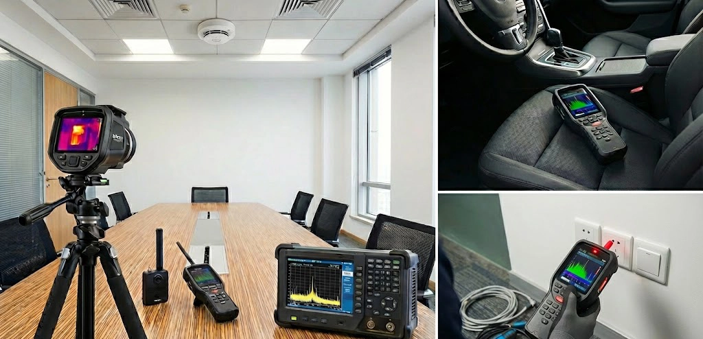 Gizli dinleme cihazları RF dedektörler, spektrum analizörleri ve termal kameralar kullanılarak tespit edilir.